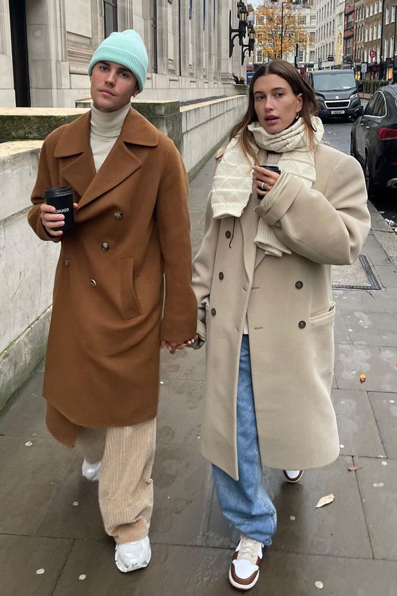 Justin Bieber and Hailey Bieber – Sweatshirts, knitted hats and oversized pieces are the link between the singer’s and model’s wardrobes. And, as this photo taken at the end of last year in London demonstrates, also the classic coats are a bit oversized. In colors as timeless as brown and camel, they could well be interchanged.