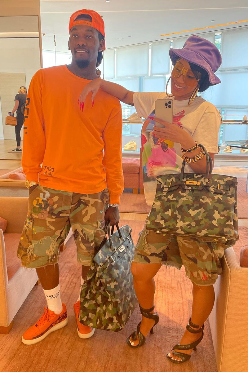 Cardi B and Offset – The most famous couple on the hip-hop scene also agree on what to wear in the morning. One of her most obvious ‘matching’ looks was this one, featuring matching camouflage shorts from the Gallery Dept brand and two Hermes Birkin bags printed with the same print. Like two drops of water (at least from the waist down).
